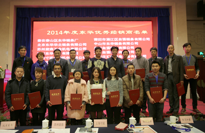 最后,內銷公司總經理戴迪漢宣讀了東華19名2014年度“優秀經銷商”名單;盾牌公司總經理錢文孝宣讀了盾牌6名2014年度“優秀經銷商”名單。董事長宣碧華向獲獎經銷商頒發了獎杯和證書,并合影留戀。