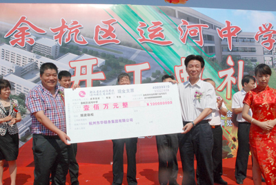 7月3日,烈日炎炎,在運(yùn)河中學(xué)舉行的開工典禮上,東華集團(tuán)董事長(zhǎng)宣碧華熱心參與余杭區(qū)運(yùn)河鎮(zhèn)組織的“捐資助校·功德千秋”慈善捐贈(zèng)活動(dòng),向運(yùn)河中學(xué)建校捐款100萬元,為“運(yùn)河中學(xué)”建設(shè)項(xiàng)目添磚加瓦,充分體現(xiàn)了東華集團(tuán)關(guān)心、支持教育事業(yè)的拳拳愛心。