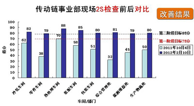 2S管理明顯提高并標準化作業 通過2S的運行,傳動鏈事業部員工的現場2S意識和管理都得到了明顯提升,如包裝車間現場管理的雜亂改善到目前的現場流程規范、通道流暢、物品擺放整齊等,熱處理車間設備運行狀態可視化等;同時廣大員工學會了總結與標準化操作,如現場檢查標準化、任務改善驗證標準化、管理點檢標準化、現場作業標準化等。