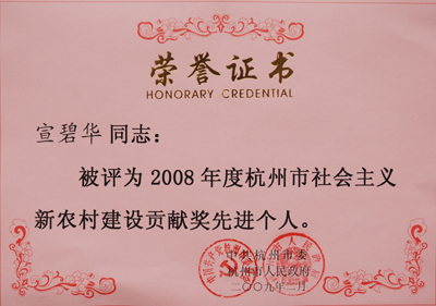 日前,東華鏈條集團(tuán)董事長(zhǎng)宣碧華被中共杭州市委、杭州市人民政府授予 “2008年度杭州市社會(huì)主義新農(nóng)村建設(shè)貢獻(xiàn)獎(jiǎng)先進(jìn)個(gè)人”榮譽(yù)稱號(hào)。