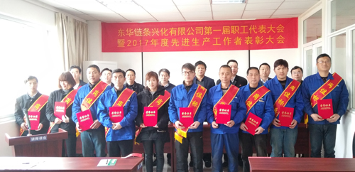 3月22日,在雄壯的國歌聲中,東華鏈條興化公司隆重召開第一屆職工(工會)代表大會暨2017年度先進表彰大會。集團副總經(jīng)理袁立華、公司法定代表蔣錫林、公司工會主席汪昌宏、公司副總經(jīng)理邱德方、劉冬根、傳動鏈事業(yè)部總經(jīng)理楊小勇及其他中層、各分工會主席、各崗位標兵、先進代表、職工(工會)代表等60余人參加大會。