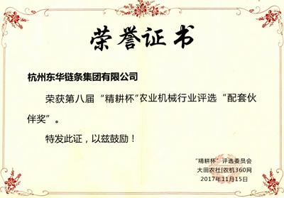 峰會后舉行了第八屆“精耕杯”頒獎典禮活動,共設(shè)置評委會“綠色獎”、“創(chuàng)新獎”、“設(shè)計獎”、“中國市場影響力品牌”、“配套伙伴獎”五大類共35個獲獎席位,推舉出了我國農(nóng)機行業(yè)的年度榜樣和年度力量。東華集團榮獲“配套伙伴獎”。
