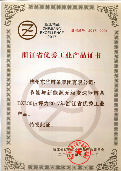 東華鏈條集團(tuán)“BXL30節(jié)能與新能源無級變速器鏈條”被授予“2017年浙江省優(yōu)秀工業(yè)產(chǎn)品”稱號