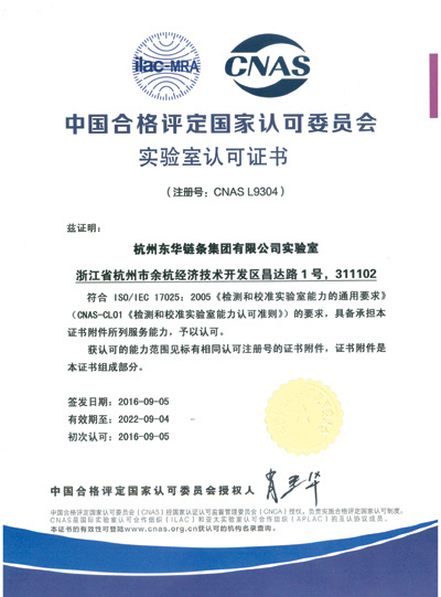 東華鏈條集團實驗室成立于2002年,是專業從事鏈條產品性能檢測及質量分析工作的實驗室,2003年5月通過計量認證,對外開展檢測和承擔政府部門的鏈條產品質量抽查、檢測等任務。為了提高實驗室的質量管理水平,同時提高國內外客戶對實驗室的認知度和可信度。公司于2014年6月份導入ISO/IEC 17025檢測和校準實驗室能力認可準則,并按要求建立實驗室管理體系。2016年7月份通過了國家認可委員會(CNAS)對申請的滾子鏈、汽車用鏈條、農業機械鏈條、輸送鏈、摩托車鏈、自動扶梯鏈等不同行業使用的16個產品標準檢測能力的現場評審。