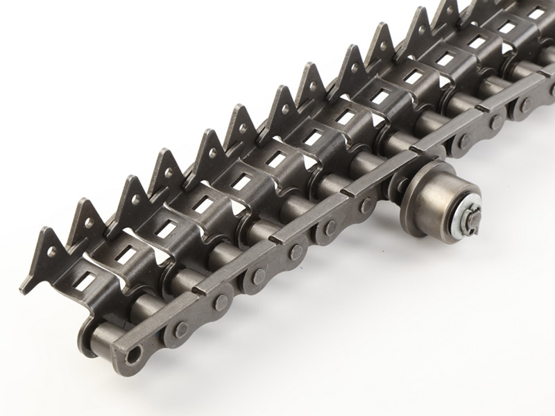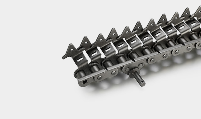 ● 印鐵烘房線鏈條是在標準短節距精密滾子鏈作為基鏈的基礎上加裝特殊附件的鏈條;典型產品結構為一側通過安裝內、外支撐片來保持鏈條直線度,另一側通過內外附板安裝花架運輸物品。